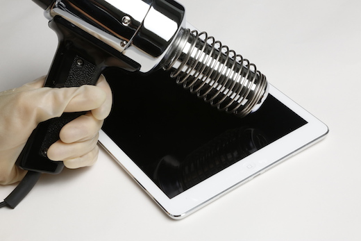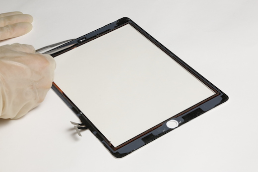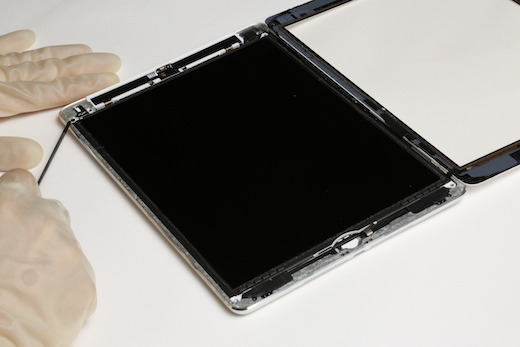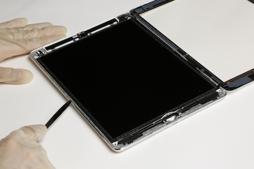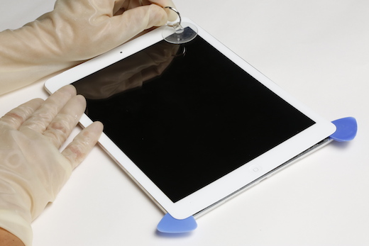 本体が温まったら、吸盤でタッチパネルを引き剥がしながら隙間にプラスチック製のピックを差し入れていきます。全て剥がすには時間がかかるため、剥がせた箇所にはプラスチック製のピックを差し入れておくと再接着するのを防げます。