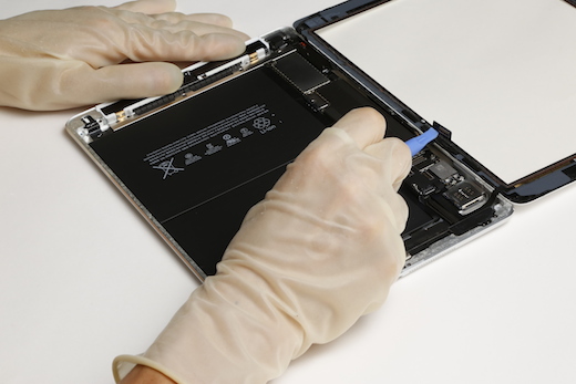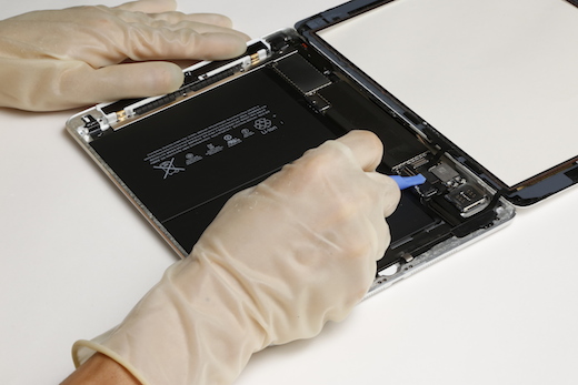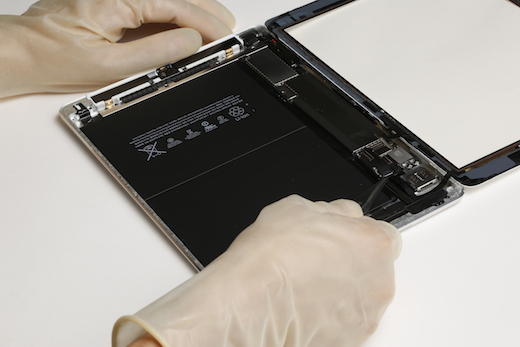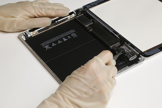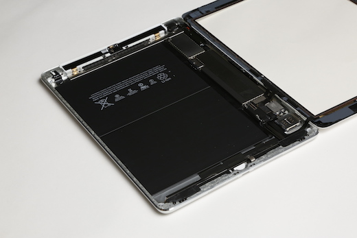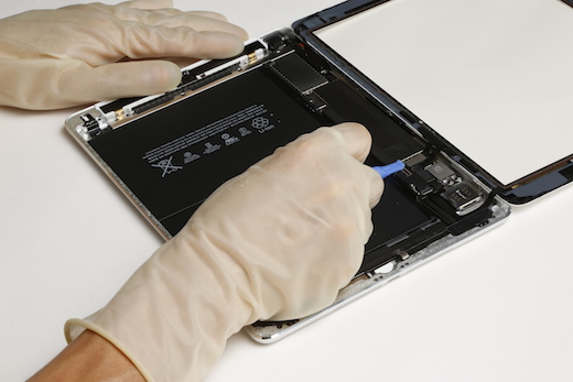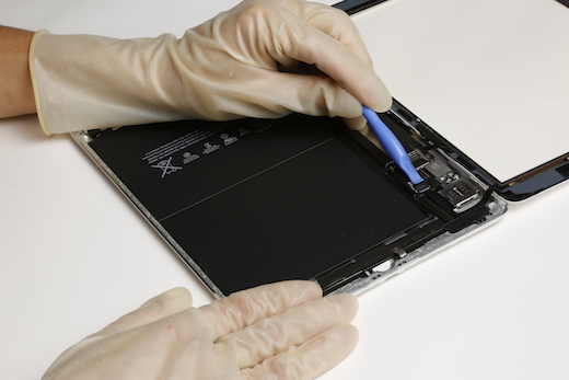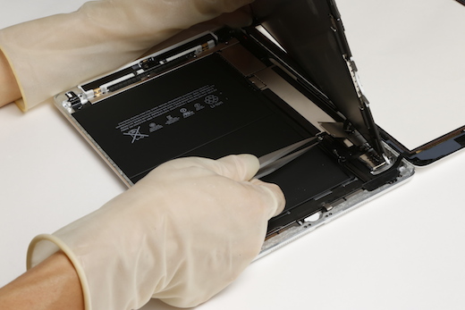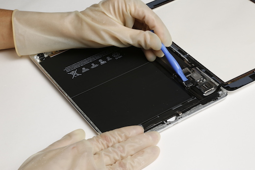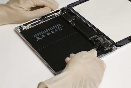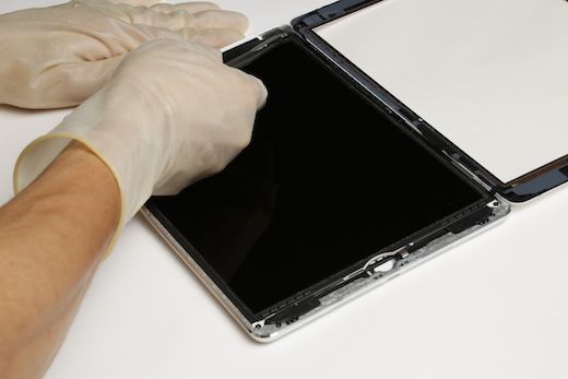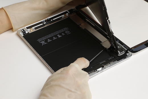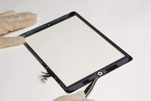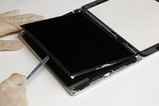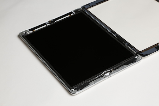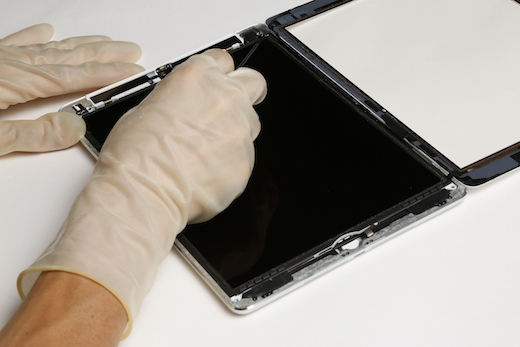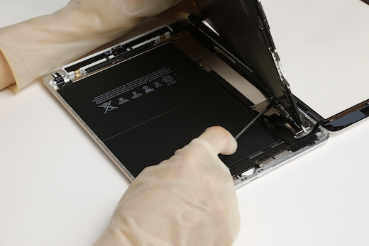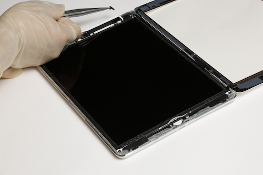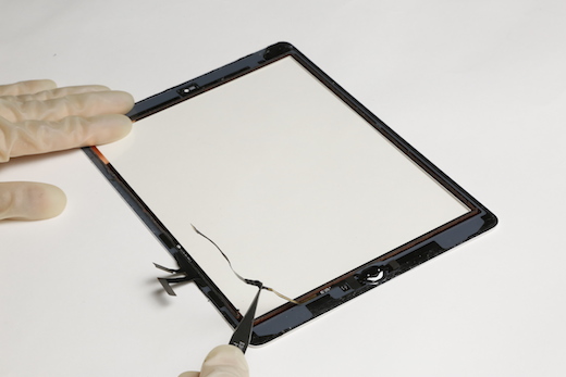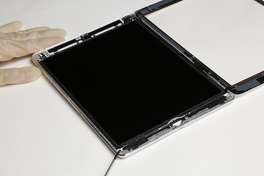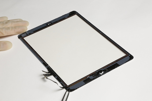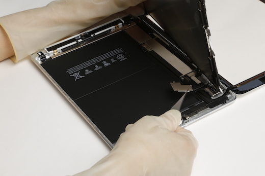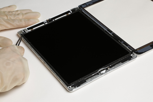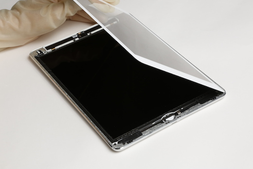 金属ヘラを差し入れて無理に剥がそうとするとタッチパネルやフレームが割れてしまう場合があります。また、本体下側にはWi-Fi/Bluetoothアンテナが、本体右側の下方にはタッチパネルと本体を繋ぐコネクタが取り付けられているため、不用意にヘラを入れるとパーツを破壊してしまう恐れもあり、非常に難しい作業のため熟練の技が必要です。